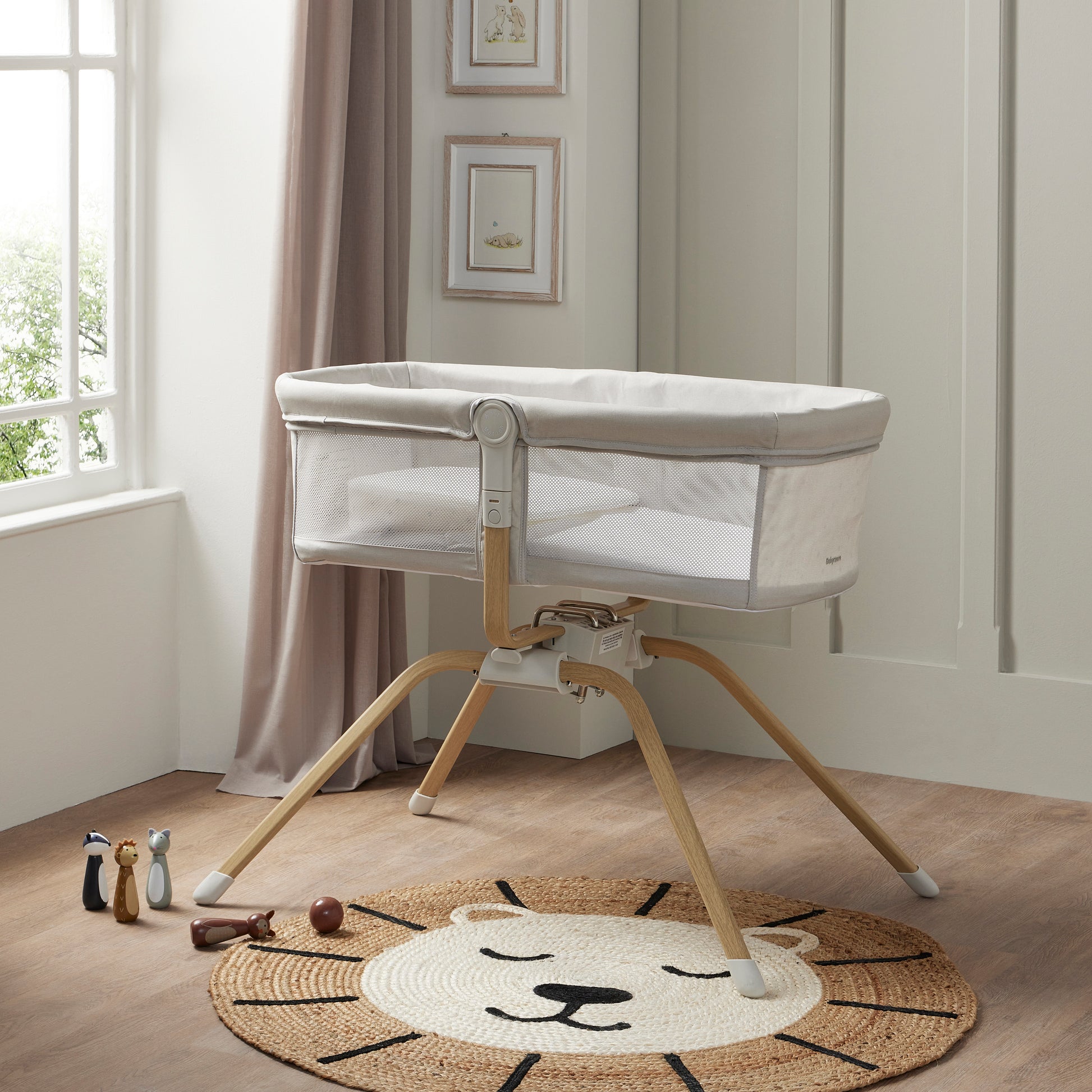 This stand-alone crib is suitable for overnight sleep from birth up to 6 months or 9 kg.
