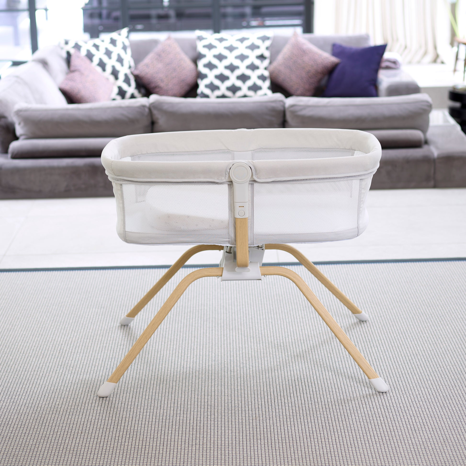 The gliding motion can be operated by a parent, but it can also start on its own when your baby stirs or rolls. This allows them to fall naturally back to sleep. It is designed to be intuitive to your baby’s movements, and as your baby stirs, the crib in turn will gently move to rock them back to sleep – rather like being in their parent’s arms. Its smooth, quiet movement is great for soothing your baby to sleep. There is no need for a parent to be continually rocking the crib, it does it by itself without the need for a powered motor which may wake your baby. The crib can also be locked so it doesn’t glide, a useful feature as your baby gets older and is ready for their transition to a cot or cot bed.