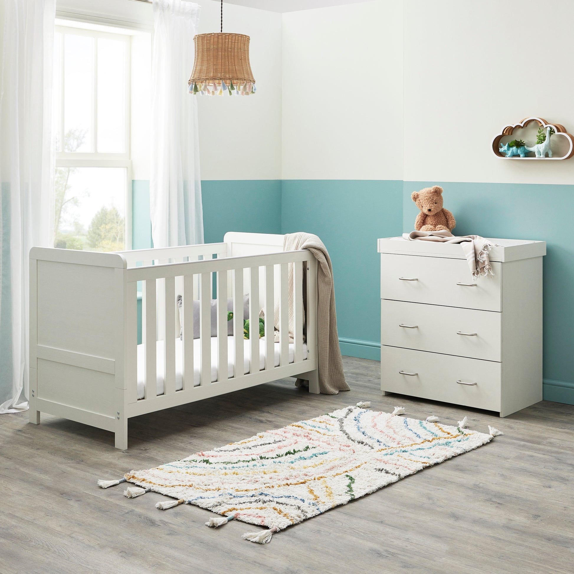 The Caro nursery collection is the ideal starting point for your nursery decor thanks to its timeless style and woodgrain finish. A stylish cot bed and versatile dresser are included in our Caro 2-piece nursery set. This cot will easily last through the first five years of your child’s life thanks to its three height settings and ability to be transformed into a toddler bed. The dresser’s changing top is detachable, transforming it from a practical baby changing unit into a chic dresser for displaying your child’s treasured possessions.